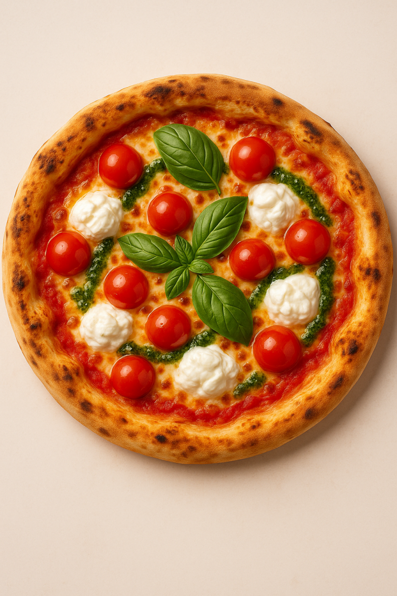 Polpa fine – Mozzarella – Tomates cerises – Basilic frais - Mozzarella di Bufala AOP (après cuisson) - Persillade - Olive – Origan