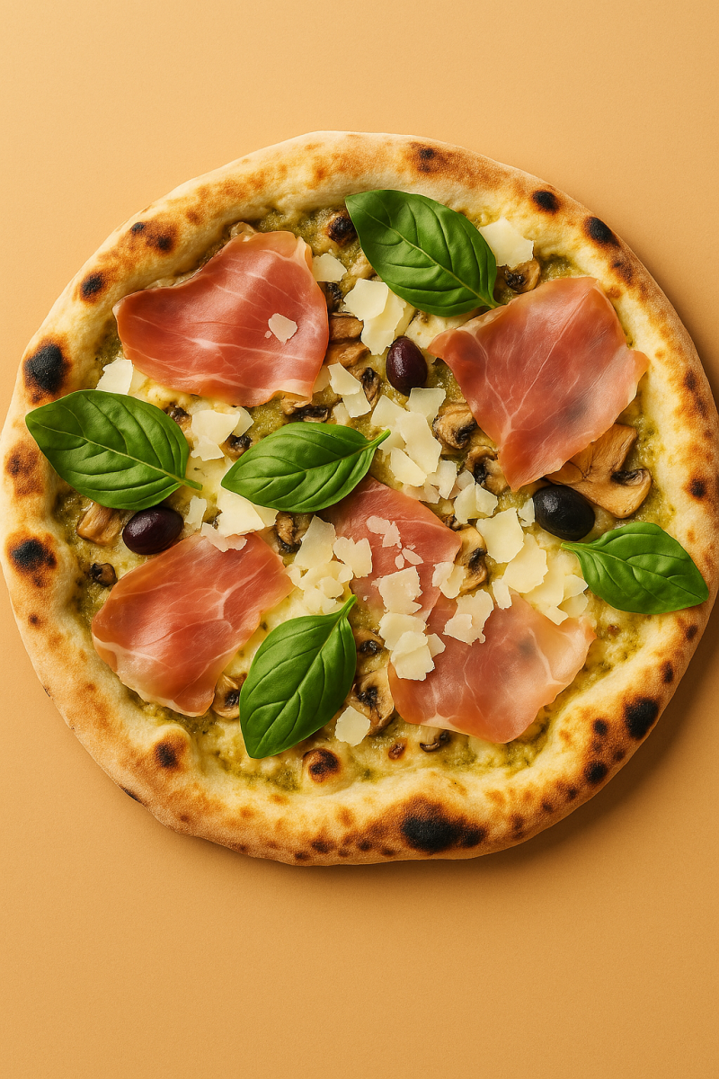 Crème fraîche / Pistou - Fromage - Champignons frais - Jambon cru - Copeaux de Parmesan - Feuilles de Basilic - Olives - Origan