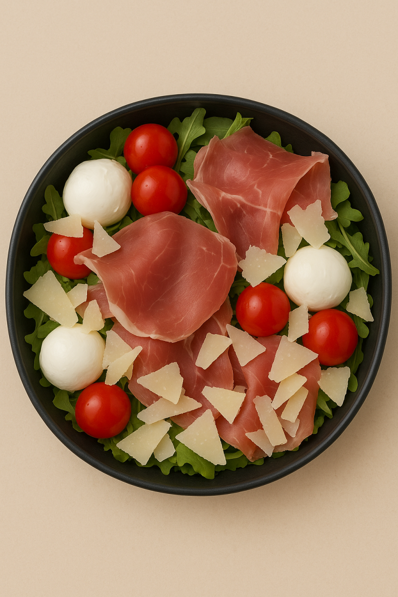 Salade - Tomates cerises - Jambon cru - Copeaux de parmesan - Mozzarella di Bufala